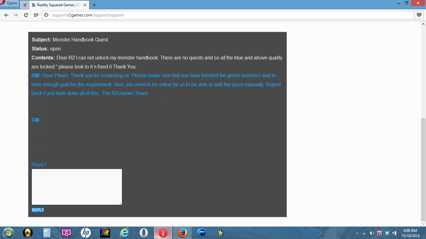 ID:	1758391my ticket number is 198046 , its about monster handbook quest , i cant seem to reply them because whenever i click reply its blank n not show anything what i write it down . Please help me solve it Reverie . Thank You