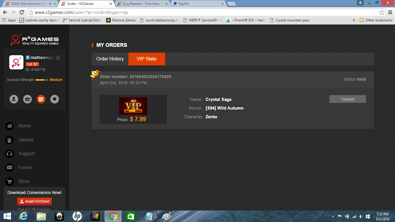 You will need to file a ticket for assistance with your VIP status. Tickets can be filed through our support page here: http://www.r2games.com/support/