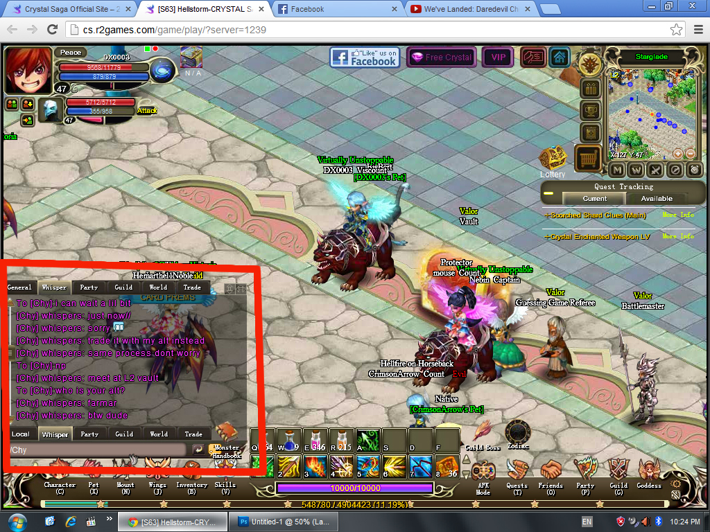 I wanted to have a July 4th promo costume for myself, so I thought about trading my 26pcs MC for one. Someone messaged me whose name is toon's name is Chy, she is a lvl 45 female knight, she has costume on her own and an Epic heart of eden and a panda pet, so I gave my trust. We commenced talking in private message and she said to meet her in SG, after a while she messaged me and said she is in bath and can't do the trade herself so she is sending her alt Falmar, it was ok for me because I really wanted the costume so again I gave my trust. The deal went on and before I gave my MC I asked here If I needed to add her as friend in order to gift me, she said it's not needed. A little bit skeptical now and doubt begins to seep in me, but then again I said to myself YOLO right! I should've trusted my guts. After the trade she said to refresh my browser to recieve my item, but before I did I made screenshots on our conversations. Here they are....