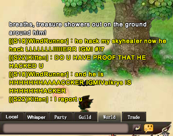 I have no idea whats with this person, (S18)WindRunner. His spamming the world chat telling that (S23)IGMIValkrys is a scammer and a hacker without a