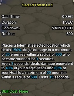Description of a skill: Places a totem at selected location which deals 150% magic damage to a maximum of 20 enemies within a radius of 500 who become stunned for 3 seconds. Every 3 seconds, deals damage equivalent to 40% of your Magic Attack and 80% of your Heal to a maximum of 20 enemies within a radius of 500. Lasts 15 seconds.