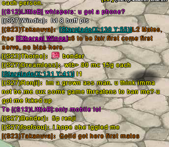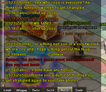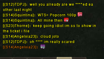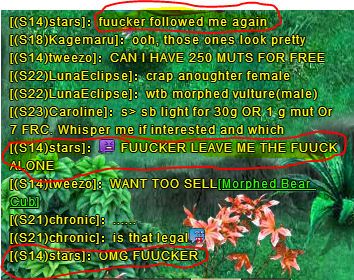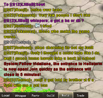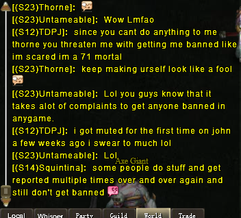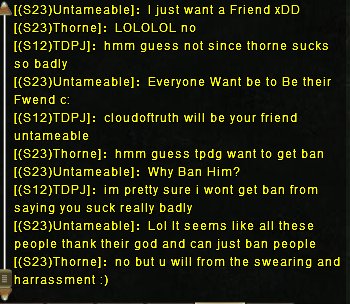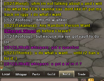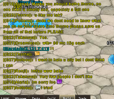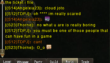 yea either people are saying mean **** to me or about me to, i guess we just have to not talk in world chat. I've played other rpg online and not had problems like this. lucky your world chat doesnt read like a porn script, my son wants to play this game but i cant let him since he knows how to read. sorry you have to deal with **** like that, i know exactly how it feels.