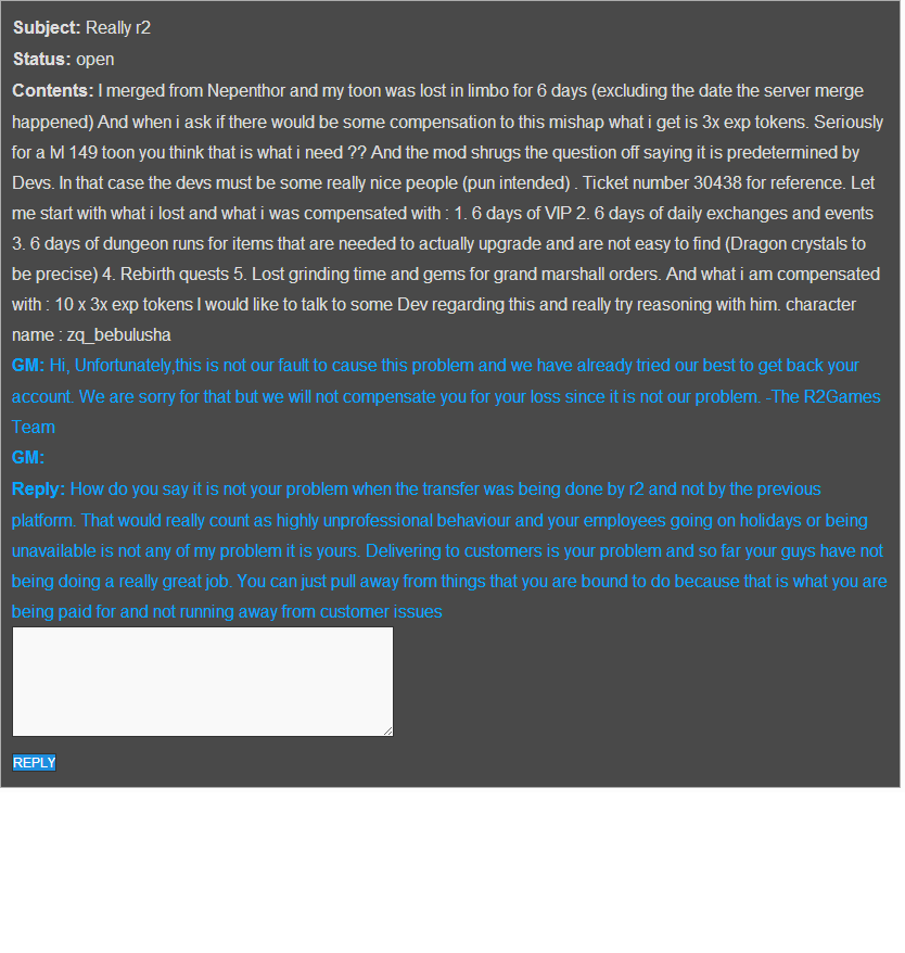 I merged from Nepenthor and my toon was lost in limbo for 6 days (excluding the date the server merge happened ie on the 20th of Jan) ie 21-27th jan And when i ask if there would be some compensation to this mishap what i get is 3x exp tokens. Seriously for a lvl 149 toon you think that is what i need ?? Chuck what i need let me note down what i lost subsequently. And the mod shrugs the question off saying it is predetermined by Devs. In that case the devs must be some really nice people (pun intended) . Ticket number 30438 for reference.