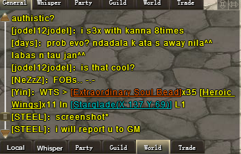that would mean there is a large disrespect for the game then an lots of TOS breaking goin on in there then. which shouldn't be happening. plz respect the game and the others who play it. they might not ban ppl right away but they could give people mutes which could eventually lead to bans if they don't respect the game and continue to filter dodge.Originally posted by lskbravo View PostLol if the gm goes about banning these guys the. U'll find servers emptyTOS aka terms of service is something you agree to and are expected to adhere by to be able to use the gm's product. which can be found here http://www.r2games.com/about/termsofuseThere is a time and a place for everything.
