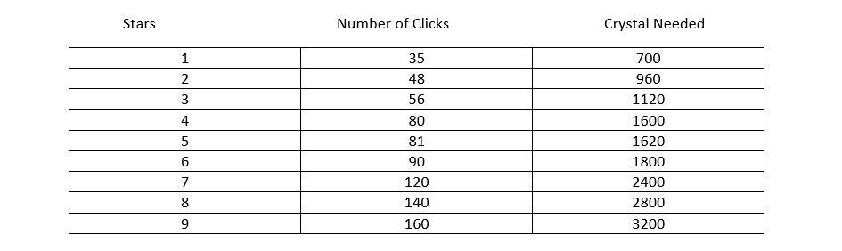 Lets say we use the first star on a rune the math looks like this completion total (350) divided by how many completion you get per click (10) which means 35 clicks to complete the Rune. Multiple that (35) by the amount of crystal you need per click (20) equals 700 crystals. You can do that for EACH star level of the rune.