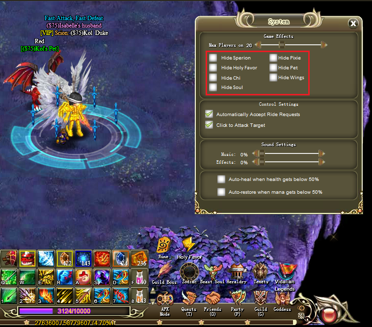 There are way too many fancy affects and things in this game now and the lag that comes from them is ridiculous. We need an option to hide each individual effect, from favor, chi, soul aura, sperions and pets, they all make it laggy and on the other version of the game they have the option to turn the individual ones off. Turning off players is useless because their auras and sperion still reappear the second they use a skill. Maybe adding something like this in the setting menu would make things alot easier.