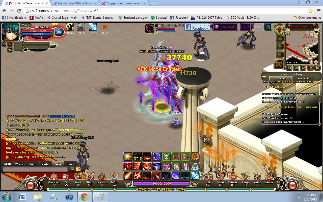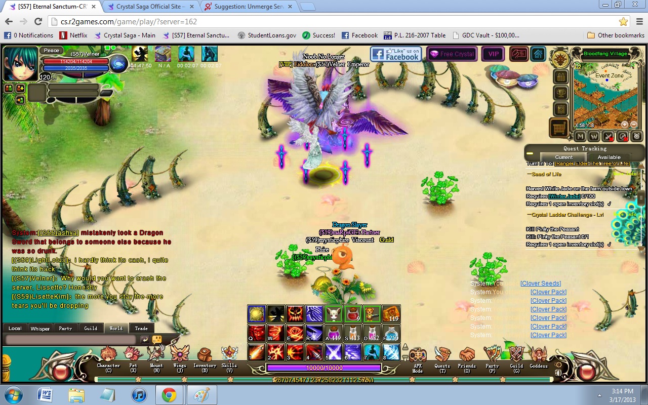 As to point three, the merger of Server 59 has found our server crawling with Kilins, Gilded Battle Stallions, and even Mortals riding Hellwings. It seems like every Scion with (S59) next to his name has an Immortal Sperion. Upgrading was obviously much, much easier on Server 59 as a result of the extravagance of the player mentioned in Point 2. I feel as if I'm now playing on a Private Crystal Saga server in which a Cash Shop doesn't exist EXCEPT I was forced to level and upgrade my character in a server where it did exist and then after all of that hard work, I get plopped into a Server where such things seem to just be handed out freely. The Top 20 Ladder Board is full of nothing but (S59) players who have been to L75 of Ladder. Not a SINGLE person on (S52)(S55)(S57)(DP) had managed to pass L66 despite being a much older server. It's just really frustrating to see all my hard work in leveling and upgrading my character become so useless.
