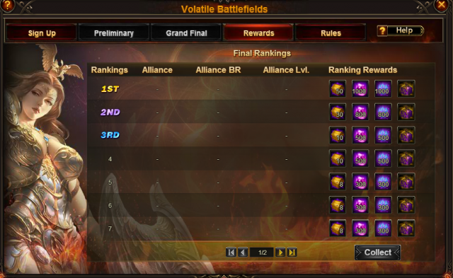 All alliances who have joined the battle will gain rewards. The Top 8 Alliances will gain ranking rewards, while the remaining Alliances will get participation rewards. Rewards can be claimed for 14 consecutive days before the next Preliminary takes place.