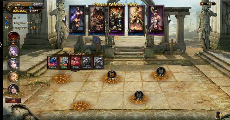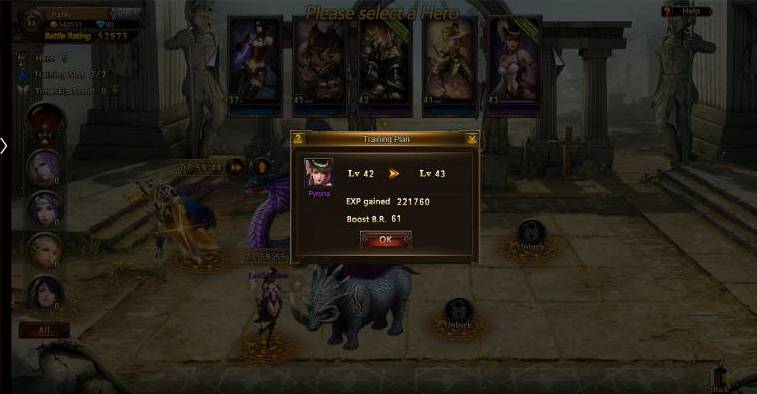 Drills are a great way to boost your Hero's level up. You can add timeskip scolls to immediately level them up or to add EXP faster. If you're out of timeskip scolls they can easily be bought with gold or diamonds in the shop.