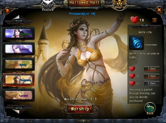 Click on the Worship icon in the Angel’s Hallowed Hall to open the Worship menu.