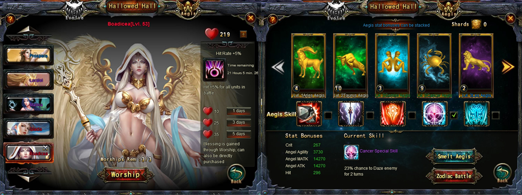 There is 12 Zodiac you can unlock to get their special skill for your Angel. All Zodiac Bonus Stat is stack and permanent. So don't worry to leveling up your Zodiac, no matter which Zodiac you equip. The higher your Zodiac level, the stronger your Angel, and it applied to all your Angel. You can upgrade you Zodiac using Aegis Shard that you can get from Zodiac Dungeon.