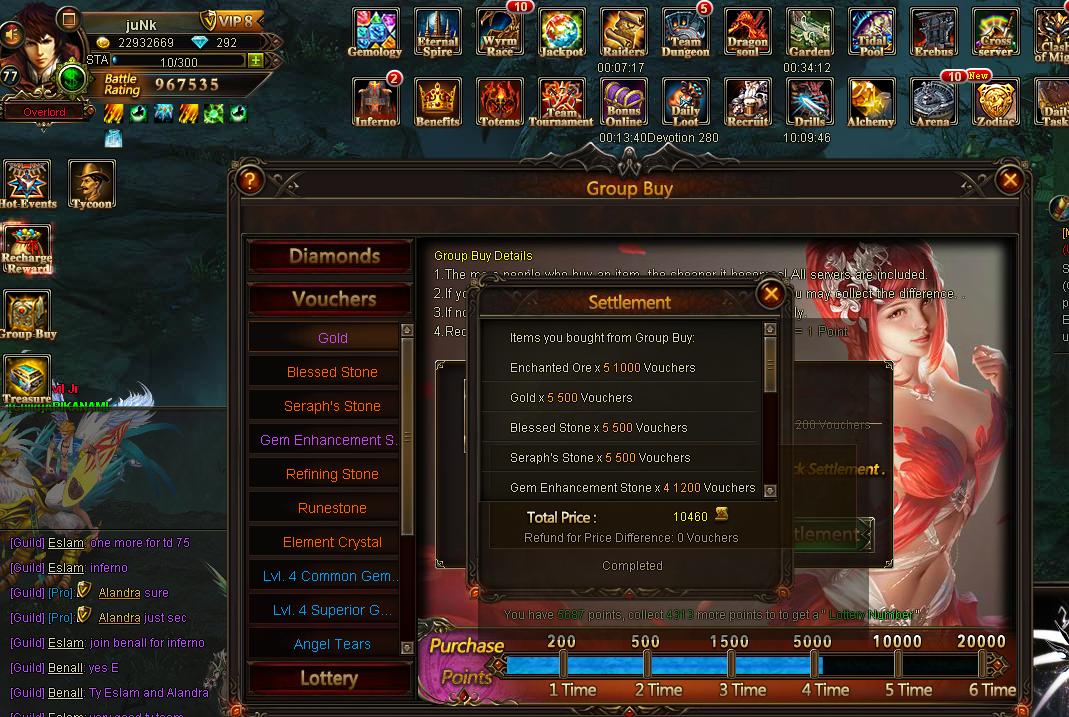 For example - Gold in voucher section . At the begining it cost 200 vouchers . if you bought it for 200 vouchers and in the end of Group Buy price of Gold reached 100 vouchers(max discount 50% off) - you'll get difference(100 vouchers) back as refund .