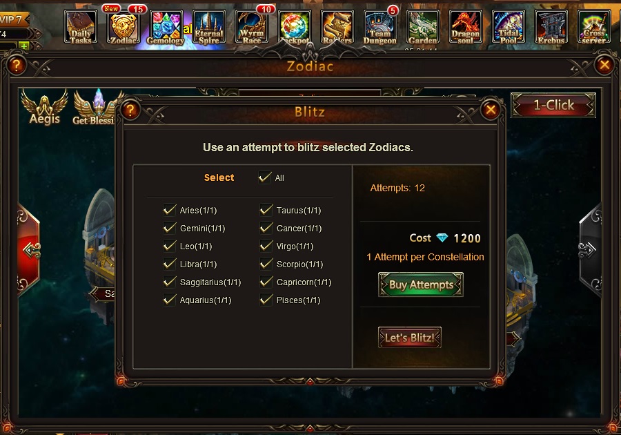 the 15 on the top states how many aegis are open for you. You probably have beaten Aries, Taurus, and Gemini Nighmare, so the remaining 3 are for those 3 purgatory dungeons.Originally posted by dyopet2 View PostAegis icon on top says i have 15 attempts, but 1-click says i only have 12. How about the remaining 3 attempts?
