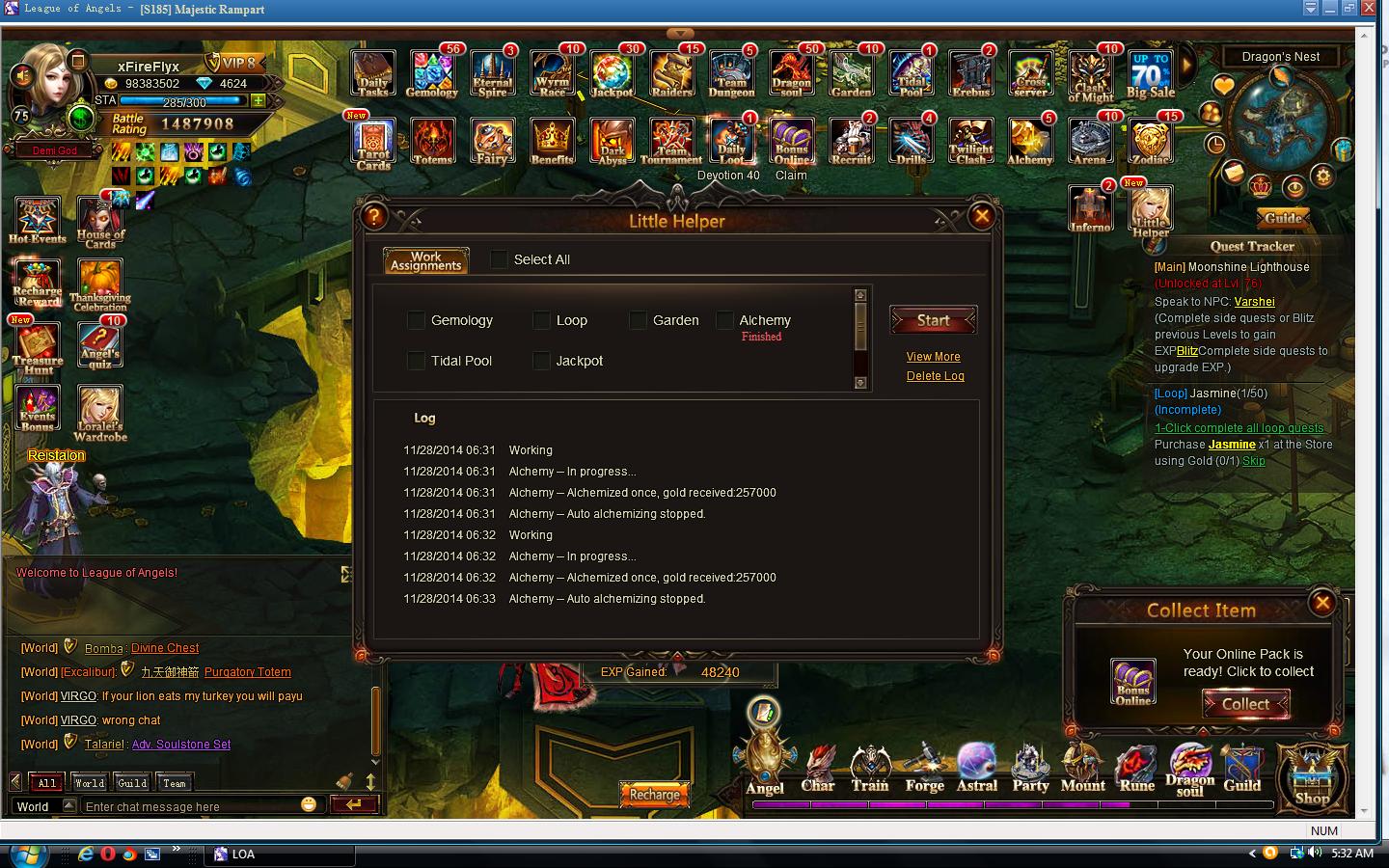 P.S. And Little Helper is great for Alchemy cause it ensures you don't use dias by mistake or lag, so yeah, call me lazy, I don't care as long as my dias are safe I will use Helper for it.Last edited by osobena; 11-28-2014, 09:39 AM.osobena