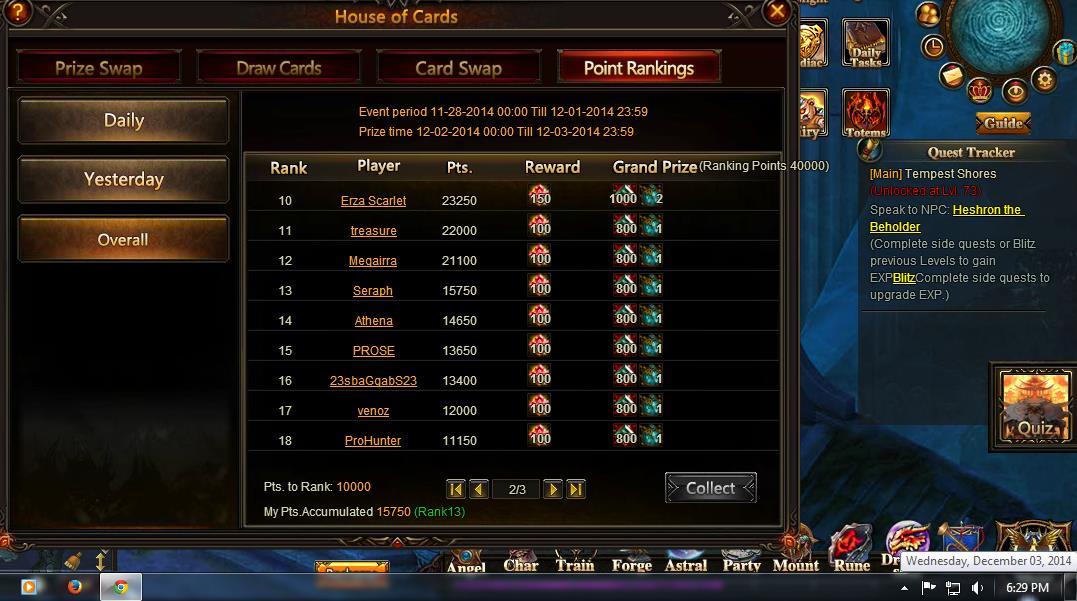 This is in reference to the recent HoC event that finished on my server (ua18 - s26 pardisia's glory). My IGN is Seraph. I havent been able to collect the cumulative award for the point rankings which is essentially 100 Seraph Stones. Please tell me what can be done about it. Please Find attached a Screen Shot fo supporting the same.