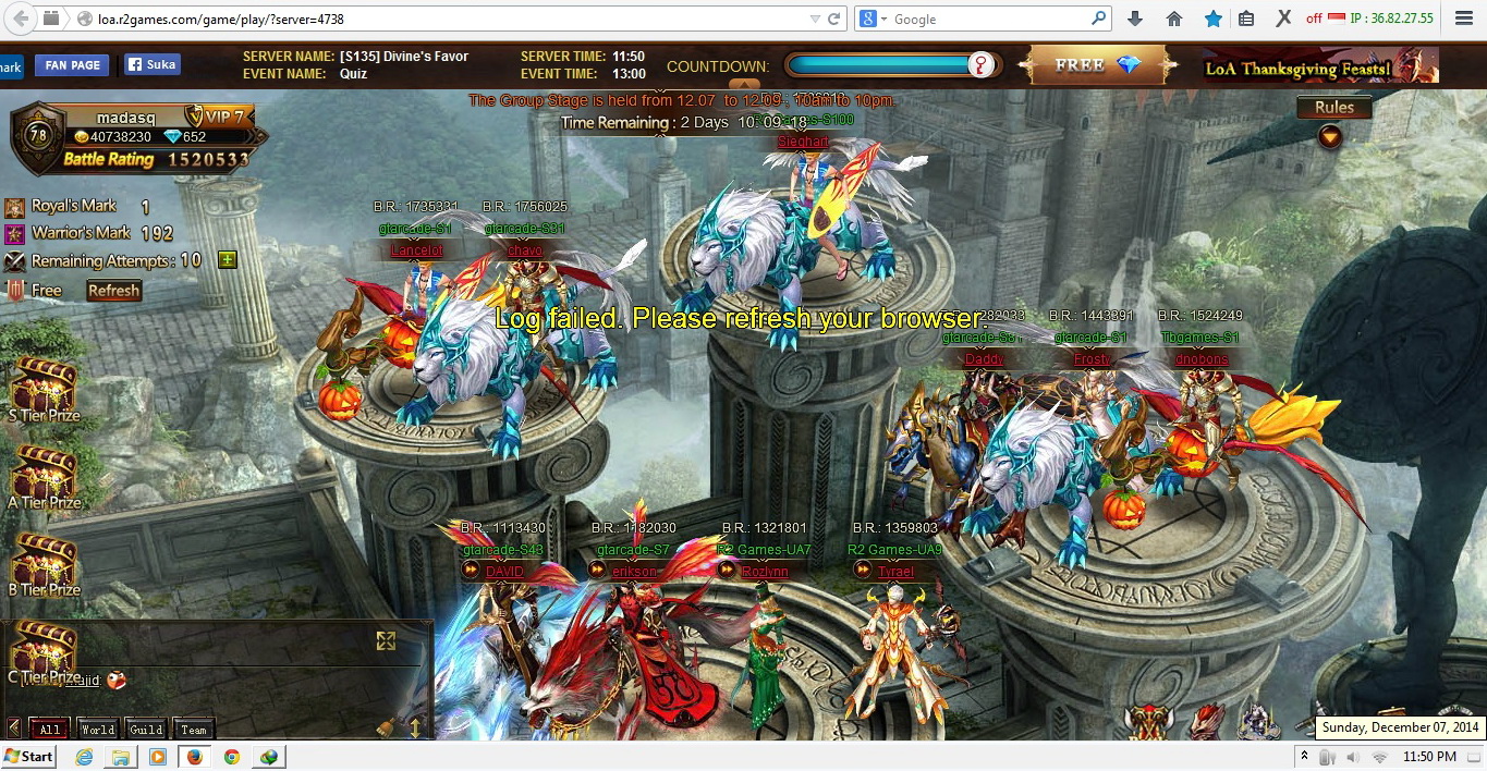 the tournament is not working, when i try to attack anyone it says "log fail. refresh your browser", i refreshed my browser and changed to another browser but it did not work. even i asked some other players in my server ua9 and they have the same problem...