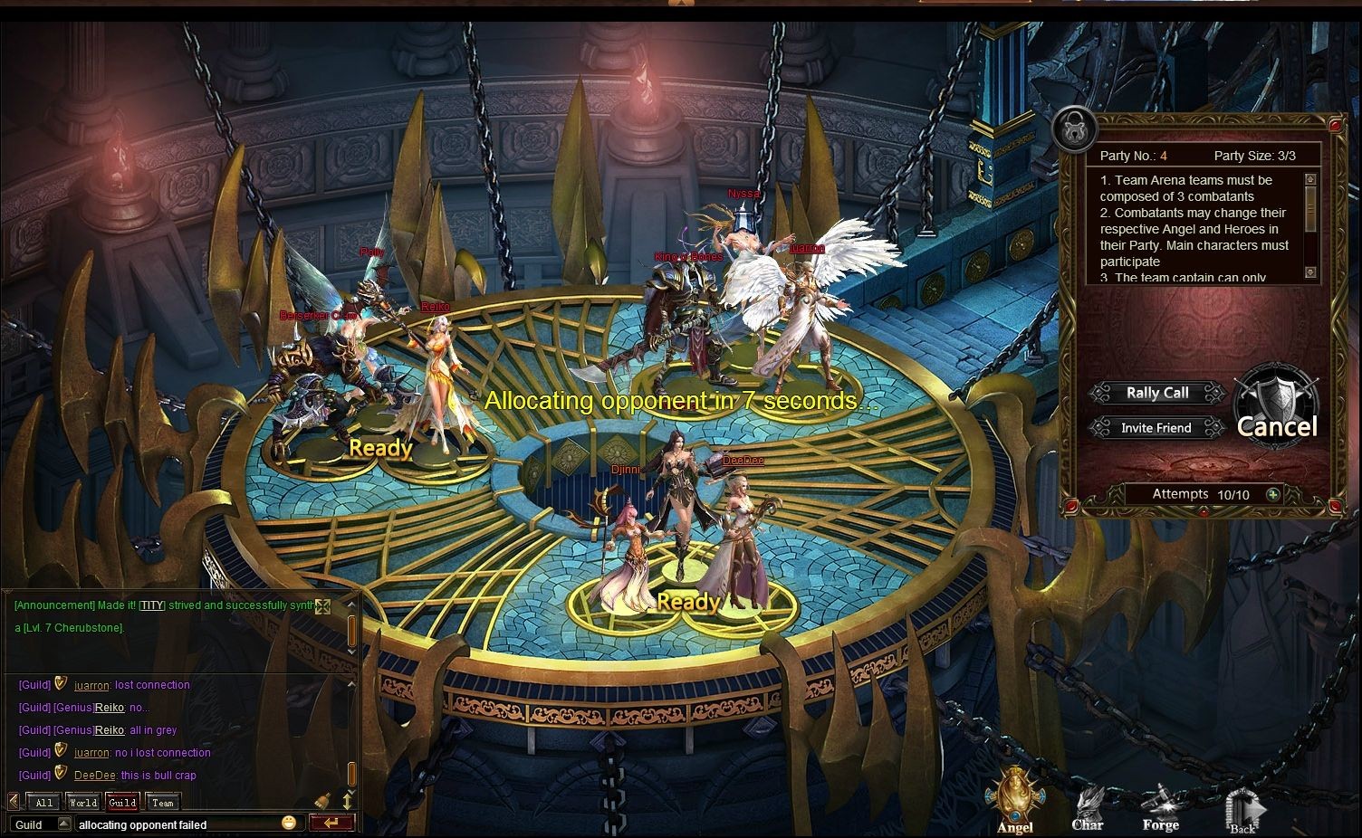 can make team, leader can click ready but all it does is count down and does not go to fight. No database error message, just nothing. countdown ends and we just sit there. no attempts taken off of the 10.