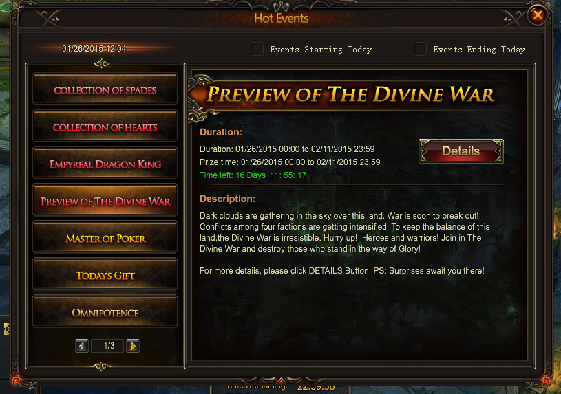 After clicking in the detail button for further details on the new event The Divine War starting today and ending on February 11, 2015, we are taken to a GTarcade page (ref. http://angel.gtarcade.com/thearchy ) and are obviously unable to login with our R2games details, are we just supposed to "preview" ie look at the Gtarcade page? Is there going to be a similar page linked at R2games LOA servers? If yes, when can we expect it since according to Hot events window description the event has already started? Thank you
