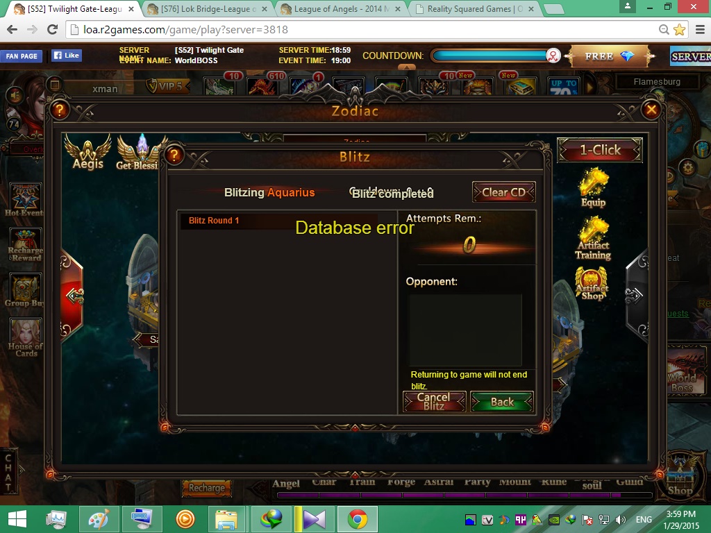 i have had an error with the zodiac and loop quests. It started a few days ago. Every time i tried to use the zodiac it showed the same message "database error". Please fix this problem.