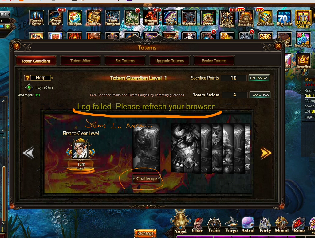 The arena attempts are lost but no points are added. The totems is not working at all.