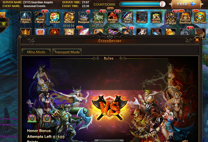 As being: Arena, Team Dungeon, Raiders, Clash of Might, Totems, Dark Abyss, Eternal Spyre in normal realm and Clash of Might in Divine Realm.