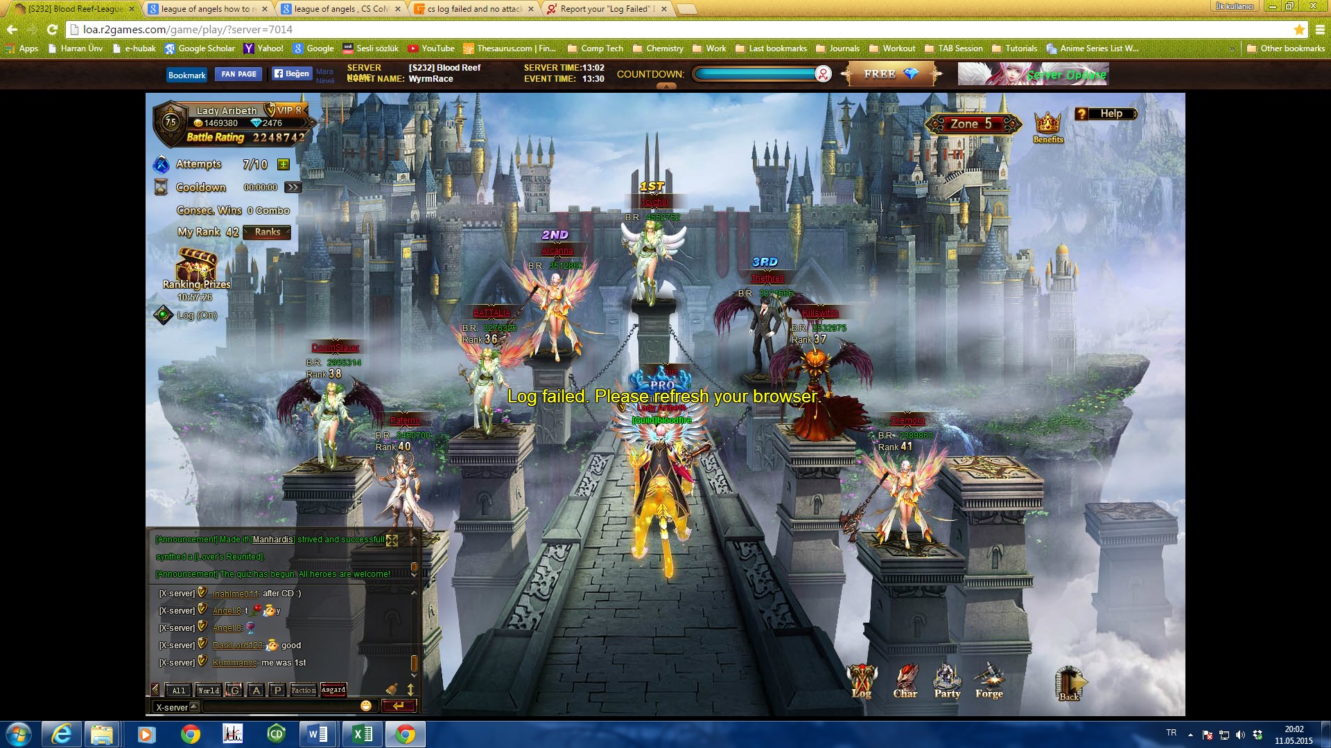 Issues : Yesterday, my tournament didn't work, it said "Log Failed". I didn't receive the points & prizes for yesterday and I'm down in the rank because of this. I am so sorry but I don't have a screenshot, this is the first time I have an issue with the game and the first time I make a report and I didn't know that I need to take a screenshot.