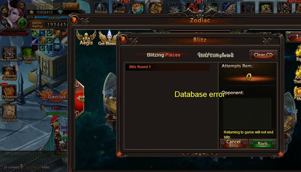 Tried to use 1-click blitz for zodiac today. Now it shows "Database Error" and I can't complete the blitz or do loops . And yeah I've tried refreshing and clearing internet history. Expecting an answer quickly. I'm already as over 4 weeks with this problem I hope you can not solve please level up and earn gold by this problem