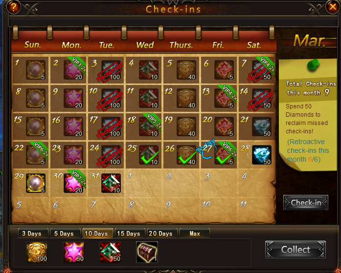I have checked in every day this month and today after I refreshed for reset my check-in calendar had erased every check in except for the reclaimed and what you see checked here. (Not happy about this, I just got robbed of 200 diamonds when I know that I haven't missed a check in pretty much since I started playing sometime in the summer of 2014.) My boyfriend said his was the same way which suggest that it was probably server/ game wide. Not entirely sure if it's actually a bug or just a really evil move by the devs but figured I'd report it in case it is.