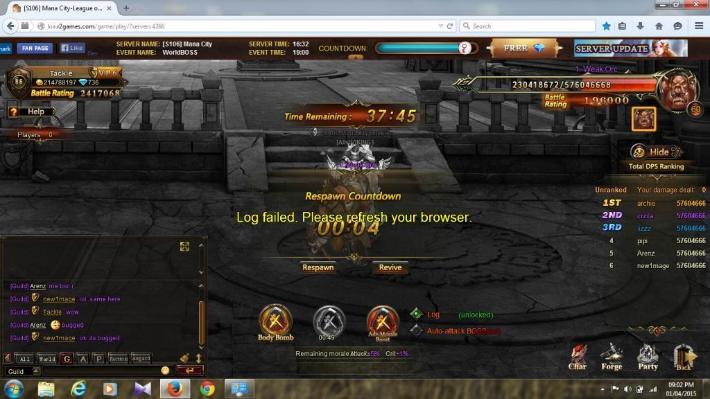 We went to fight demonic war boss .. and a message poped up with was similar to "APRIL FOOL " - > "LOG FAILED .. REFRESH UR BROWSER"