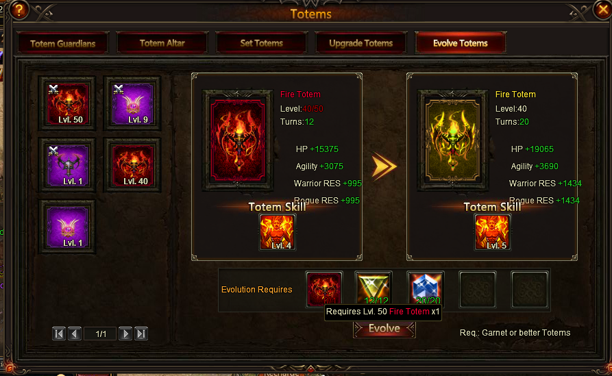 First things first, the reason why everyone is saying you need 2x L50 ruby totems to evolve to a gold totem is because 1 is the main totem to be evolved and 1 is for sacrificing. Another reason is only L50 ruby totems may be evolved, a L40 totem does not qualify for the requirement as main totem.Originally posted by Fazer600 View PostYes that was the case with the previous evolves but I was trying to evolve a L40 totem. (2 x L40 that I had) but it asked for a L50. The totem in the evolve slot is L40.