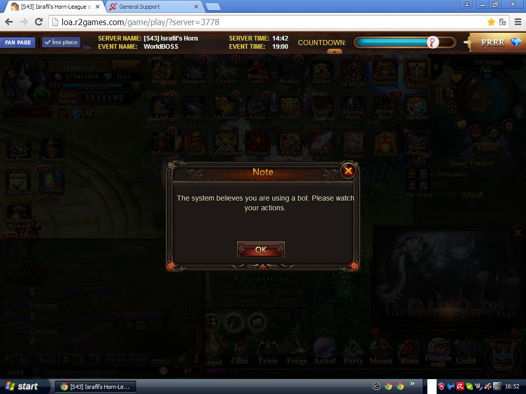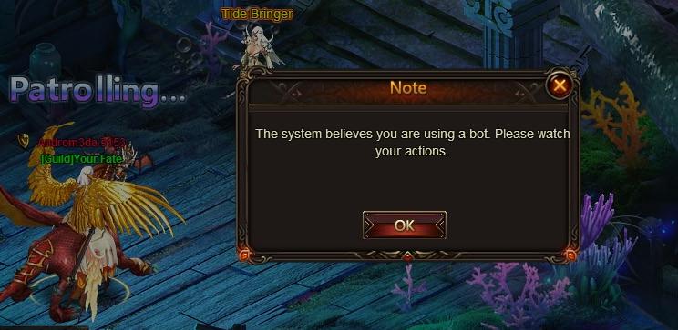 "The system believes you are using a bot. Please watch your actions." What the hell????? I'm sorry i didnt make a screen shot to show you. What am i to think? That i am using hacks? That would be the biggest joke or prank this game would play on me.