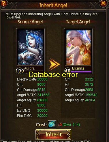 Issue: Happened on the 08/11/2016 09:38 server time. Under angel function (Inherit). When i was about to inherit from one angel to another, occurs 'Database Error'. As noted above.