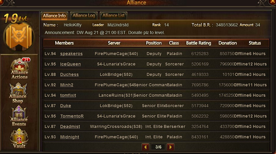 My Alliance Deputy Leader was booted from our divine realm alliance during the alliance glitch. I had to accept her back but she lost all donation points. This needs to be remedied for her asap. Her name is Duchess (server 52 Lok Bridge on the Facebook platform). I have attached screenshots of her donations points both before and after. She needs her points adjusted back to what they were prior to the glitch. Our alliance name is HelloKitty.