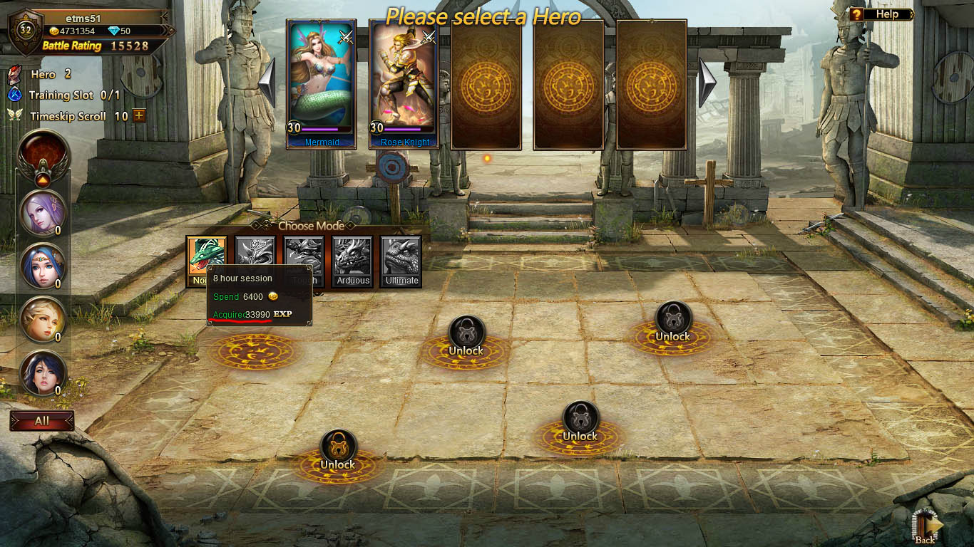 5) the game shows a new place of the game where there are some heroes card to choose. If i choose one hero, the game appear an another menu where i can choose the mode of hour.