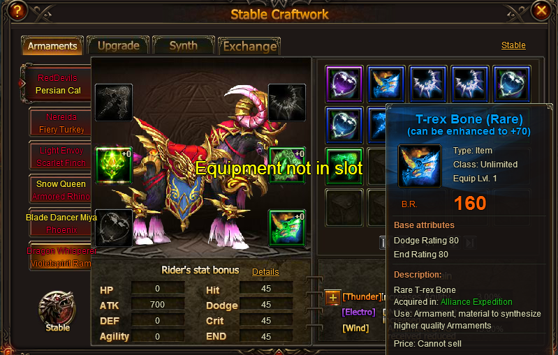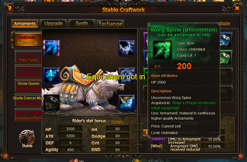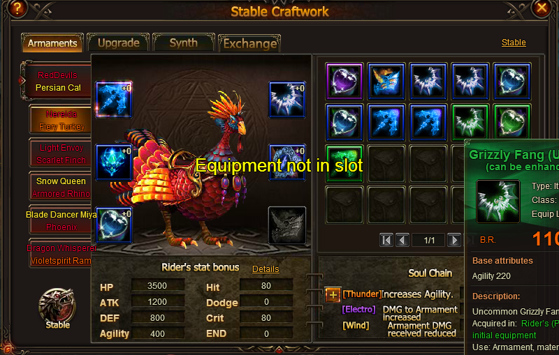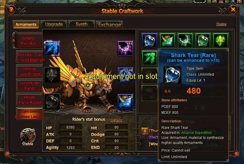 I buy from lucky tree Tiger Eye -Epic and remove the uncommone one from my armaments. Surprise! I can't use any of them, now. I have just a mesage about " Equipment not in slot " . What can I do now? Thx !