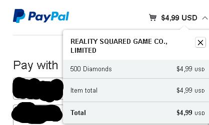So I wanted to buy 500 diamonds with 4.99$ via paypal. The price that I had to pay to paypal was 6.19$ instead of 4.99$. I ended up not buying it.