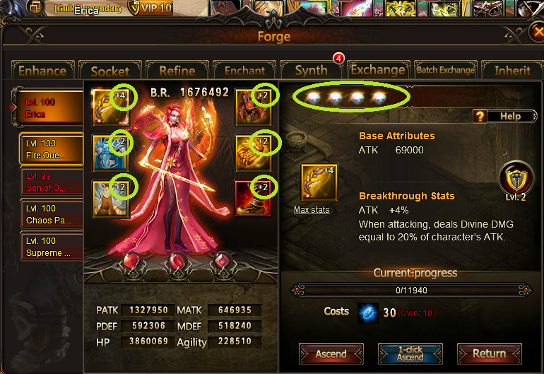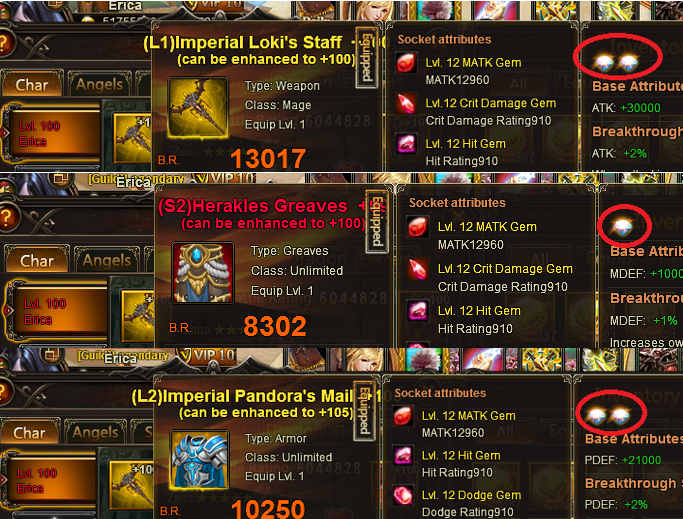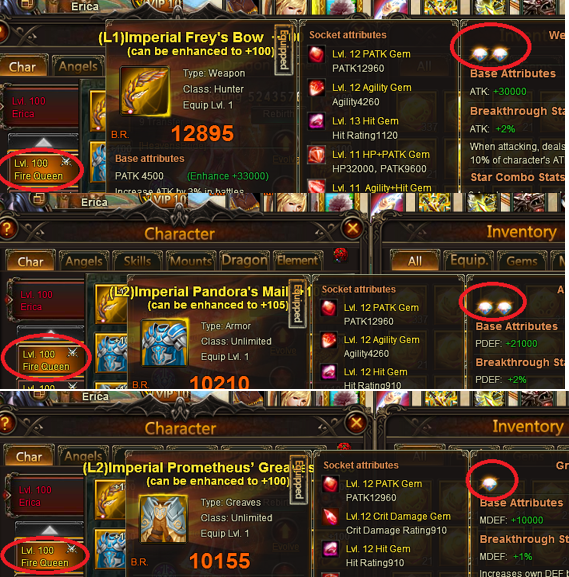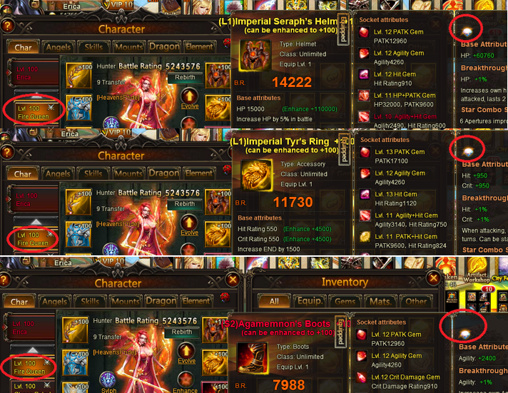 But, it doesn't go for heroes.. following the attached image below. Fire Queen supposed to have 4, 2, 2, 2, 2, 2. Having the wrong ones of 2, 2, 1, 1, 1 ,1. All other heroes are randomized as well. Weird thing is, every time i refreshed / re-log back into the game. The gems depicted in character tab (heroes) different.. never goes the same as what it appears in "enhance evolve".