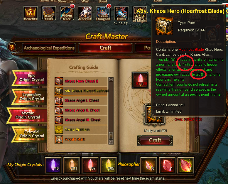 1) Description of chest clearly says top skill, which means that you have those stats when you max out khaos training. More explanation in this thread http://forum.r2games.com/showthread....est-says-it-is