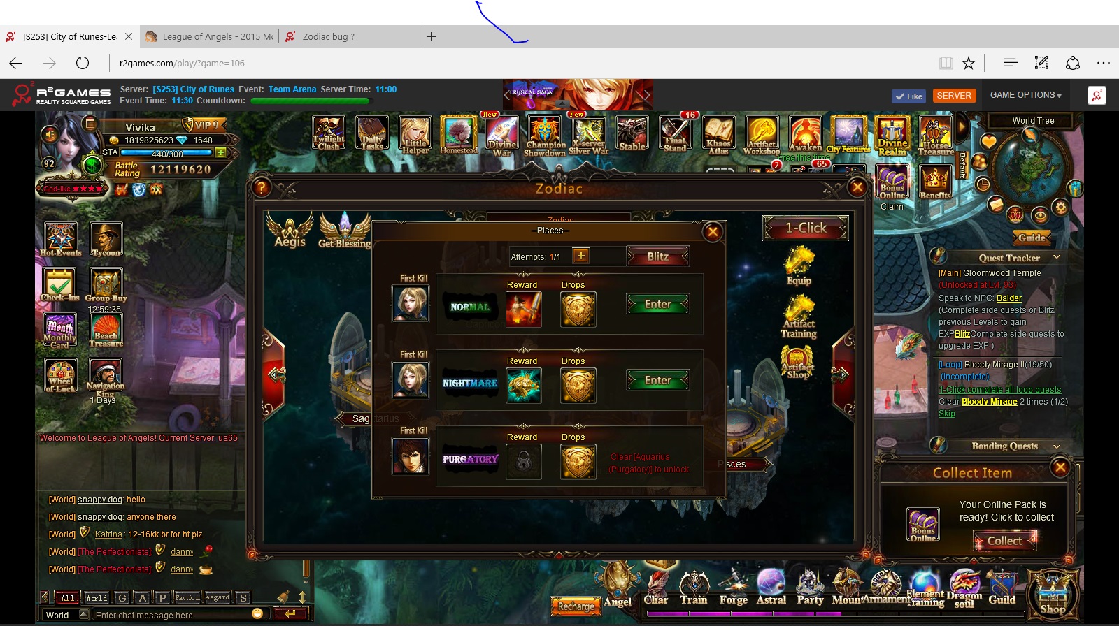 s253 vivika I have cleared nightmare and others have cleared all purgatory in zodiac yet phoenix nightmare reward is still locked and is the same for every one in our guild so this means no one can get rewards for clearing other levels as says locked even though most have cleared all levels ? can some one please look into this and the bug in cs clash where some even though they get the kills can not advance in rank ?