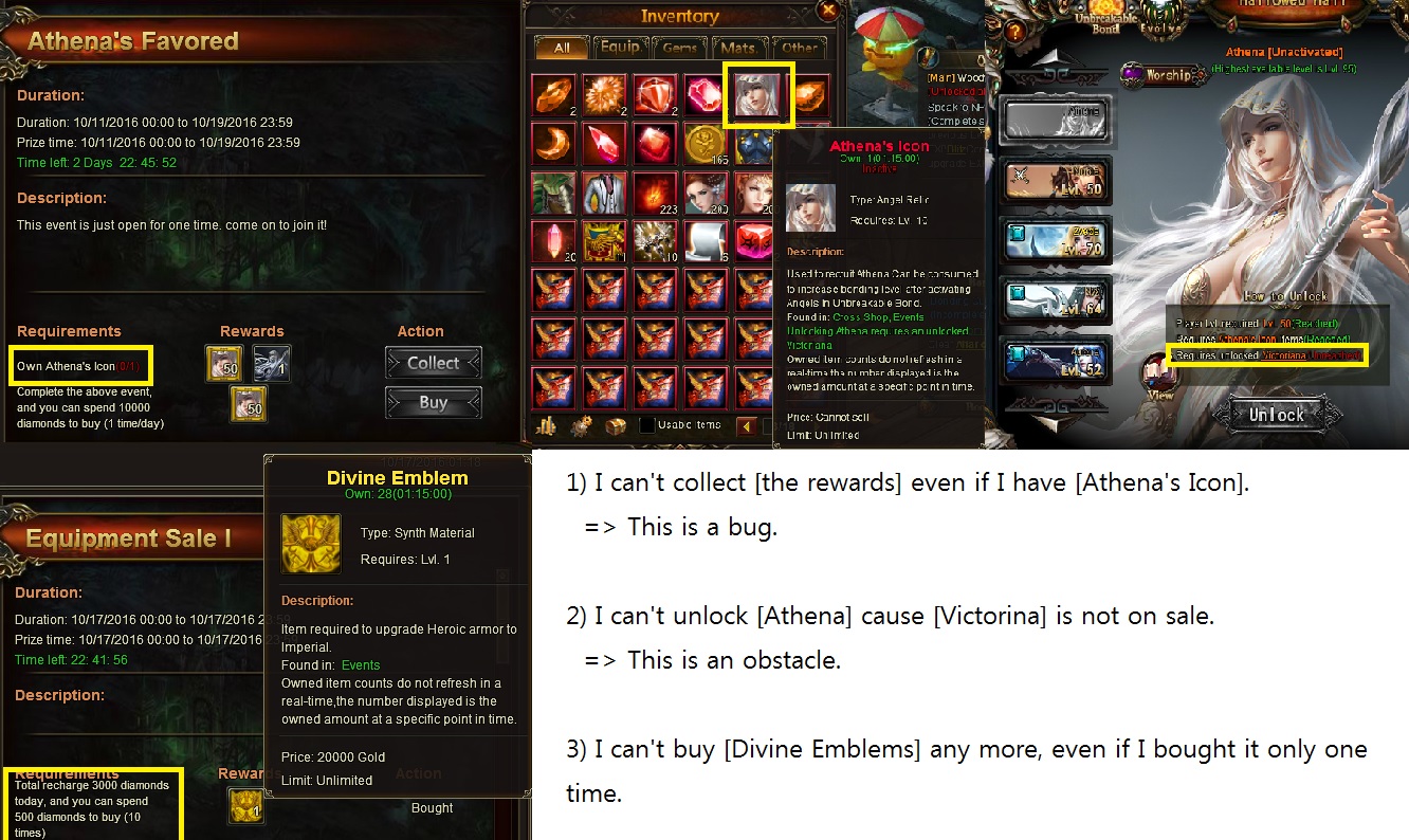 1) I can't collect [the rewards] even if I have [Athena's Icon]. => This is a bug.
