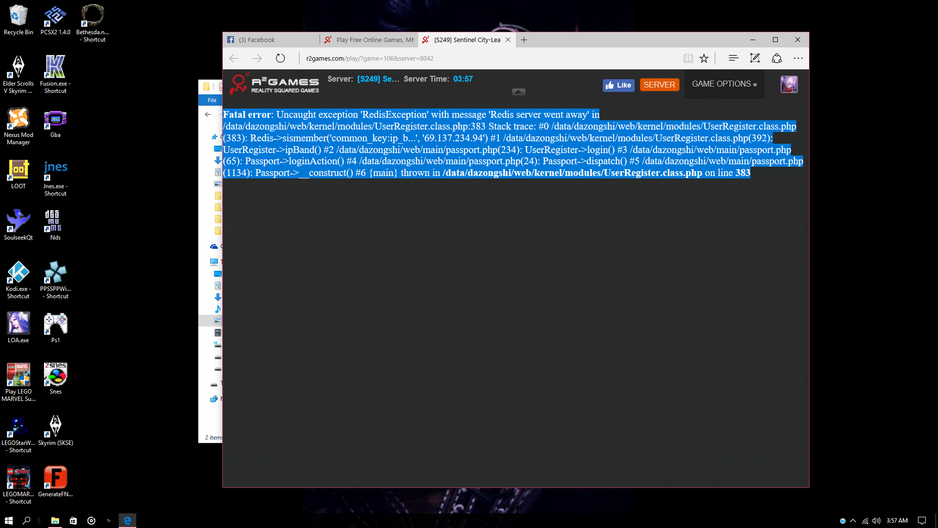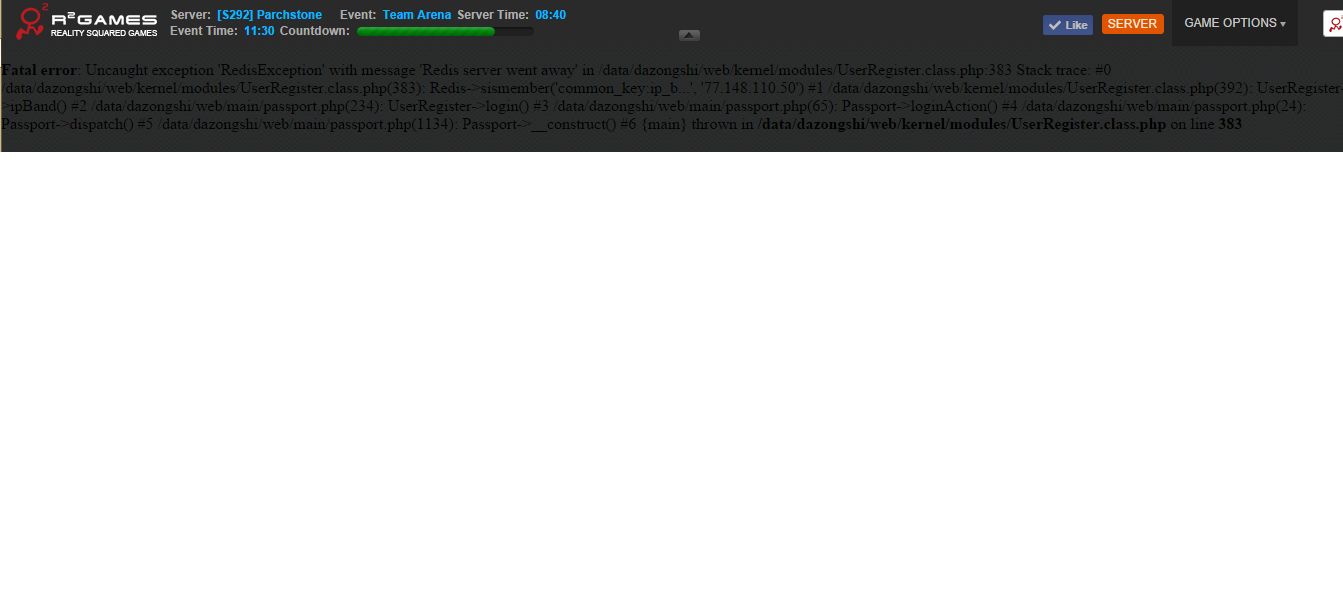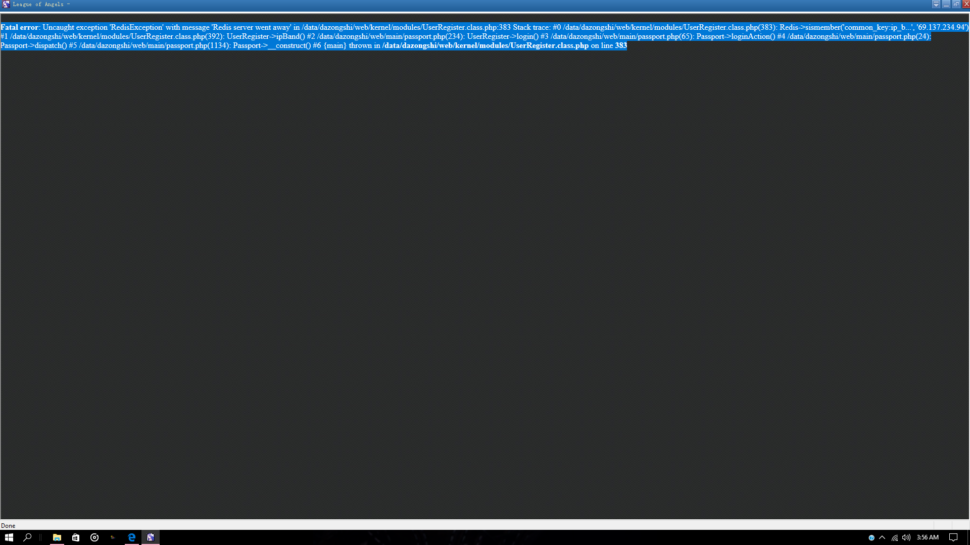 Fatal error: Uncaught exception 'RedisException' with message 'Redis server went away' in /data/dazongshi/web/kernel/modules/UserRegister.class.php:383 Stack trace: #0 /data/dazongshi/web/kernel/modules/UserRegister.class.php(383): Redis->sismember('common_key:ip_b...', '24.114.70.240') #1 /data/dazongshi/web/kernel/modules/UserRegister.class.php(392): UserRegister->ipBand() #2 /data/dazongshi/web/main/passport.php(234): UserRegister->login() #3 /data/dazongshi/web/main/passport.php(65): Passport->loginAction() #4 /data/dazongshi/web/main/passport.php(24): Passport->dispatch() #5 /data/dazongshi/web/main/passport.php(1134): Passport->__construct() #6 {main** thrown in /data/dazongshi/web/kernel/modules/UserRegister.class.php on line 383