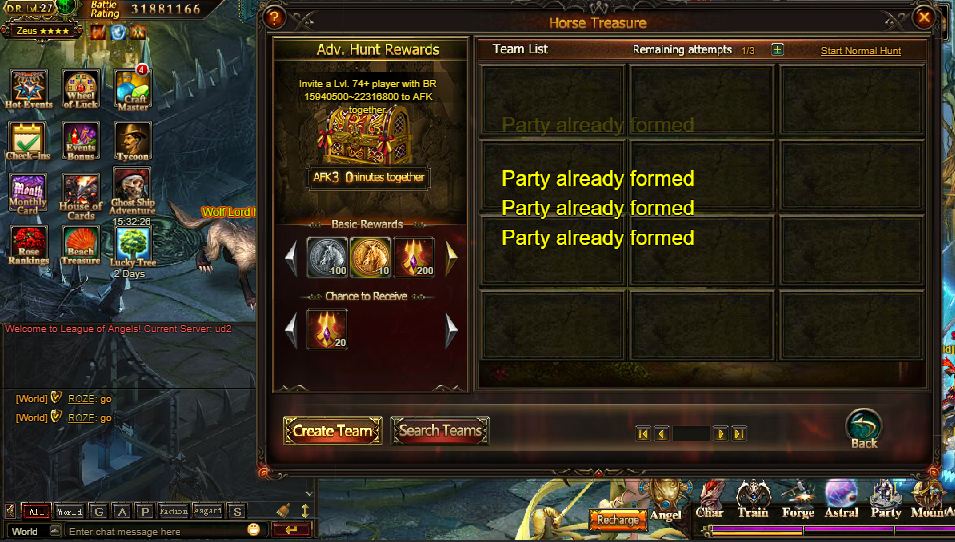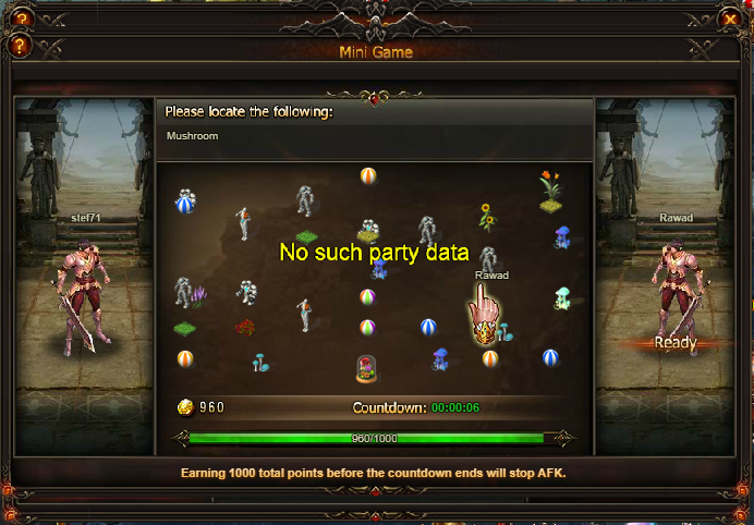 While playing HT (before the end) trying to gather mushrooms...click on items i got the message "No such party data" .... and the HT window got frozen (?!)