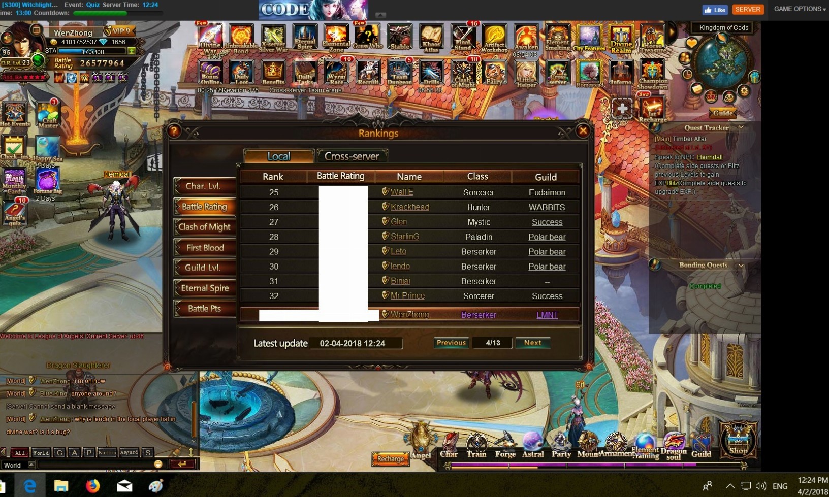 EDIT: As far as I can remember in that Local player list ... there's any player from server who signed up for DivineWar?!? (the Sign-up period is not yet over and closed).Last edited by Sidhe; 02-04-2018, 02:42 AM.REQUIRED INFO: Don't forget to provide your IGN, server name & number and screenshots for the issues & problems experienced. Recharge issues will require your transaction ID. Screenshots provided must be uncropped and timestamped.