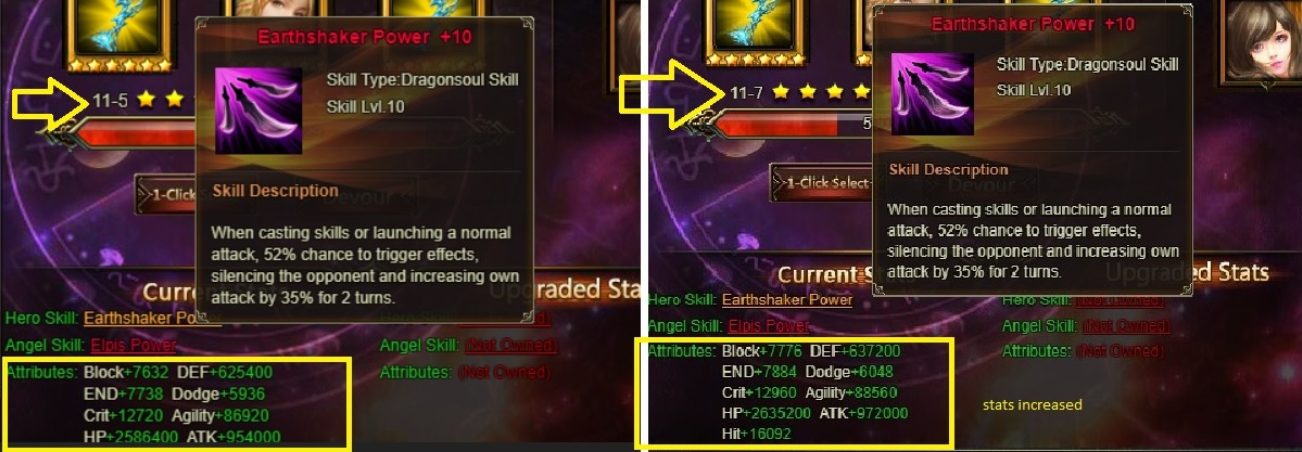Here is my understanding of this. Until some months ago the max level in Khaos was 10.10, and the upgrade to that max lvl showed values on both Current and Upgraded stats. After the training lvl was increased over 10.10 there appears this message with "skill not owned" on Upgraded stats (visual bug?! maybe). The skill lvl on hero and angel is +10 max, that won't change nor it will increase, what will increase is the attributes once you upgrade card/s on hero and angel over 10.10. Here is a series of ss, maybe it makes this more understandable: