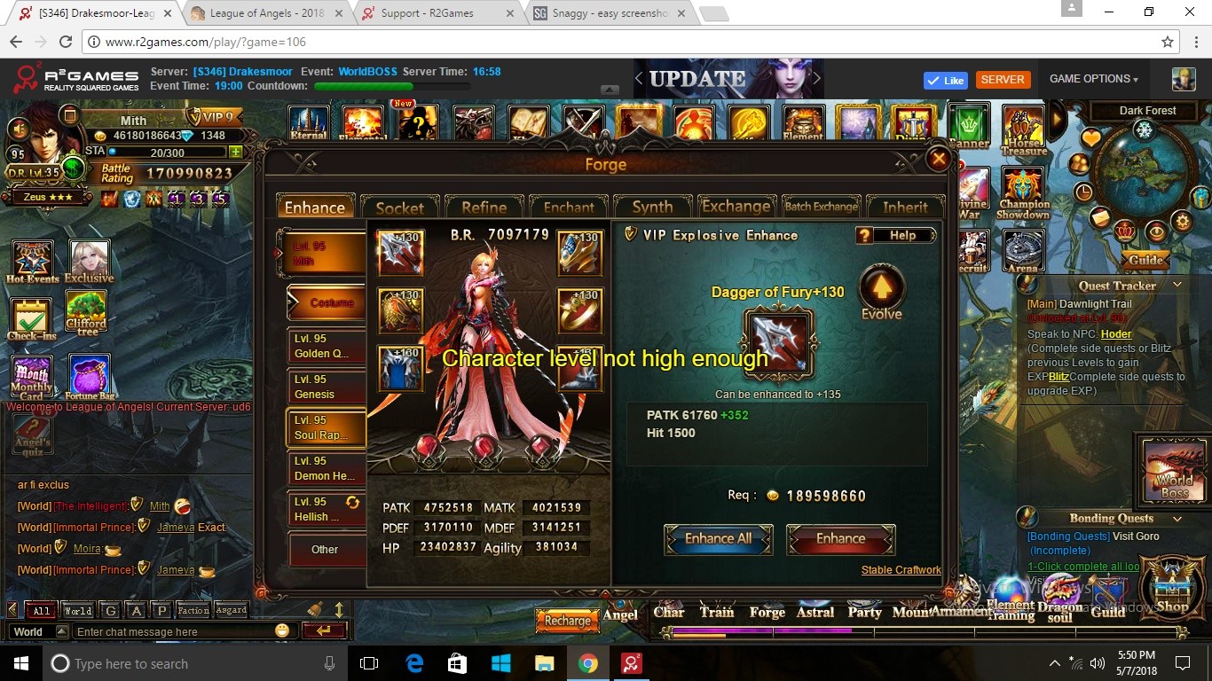 I sent allready 2 tickets with this problem.I cannot do enhancement on my DR gear to 135 . i send print with problem and everithing ...still no response , what do