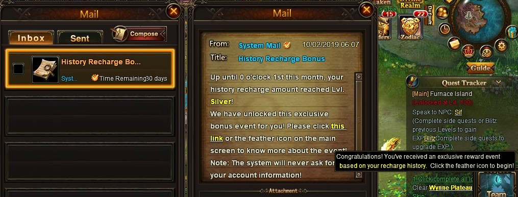Can you also check and post a screenshot of the mail usually sent to players when event starts (to players for which toon a recharge has been performed, ever)? If you can find the mail there, of course. Just something to remind you how event works and in which circumstances:
