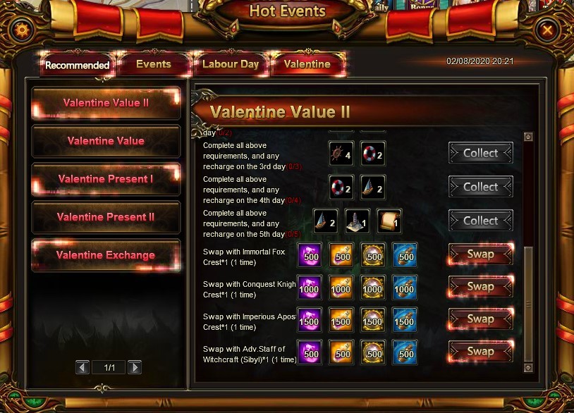 I just submitted a ticket because I was unable to SWAP my extra Advance Staff of Witchcraft (Sybil) for rewards in event Valentine Value 2.