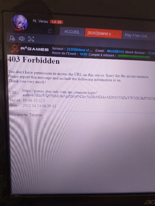 I can log into S355 with no issue. I don't know how to fix 403 errors. You can send in a ticket to support and ask them to check.Originally posted by b.sylvia83 View PostBonsoir MemoryLane oui j ai plusieurs fosi rafraichit la page je me suis déconnectée et reconnectée avec ce meme message d erreur 403 j ai vider le cache jeu etc rien. J ai pu entrer dans le jeu en cliquant sur mon serveur. Vasaliuta aussi à le même soucis donc il y a réellement un probleme de site du jeu? J espere que cela ne sera pas tout les jours come ça