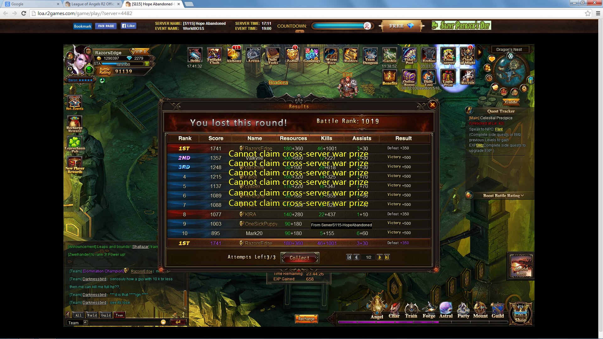 Here we go again-I didn't get any bonuses for not being able to log in to Cross Server, got stuck and not allowed to get back in.
