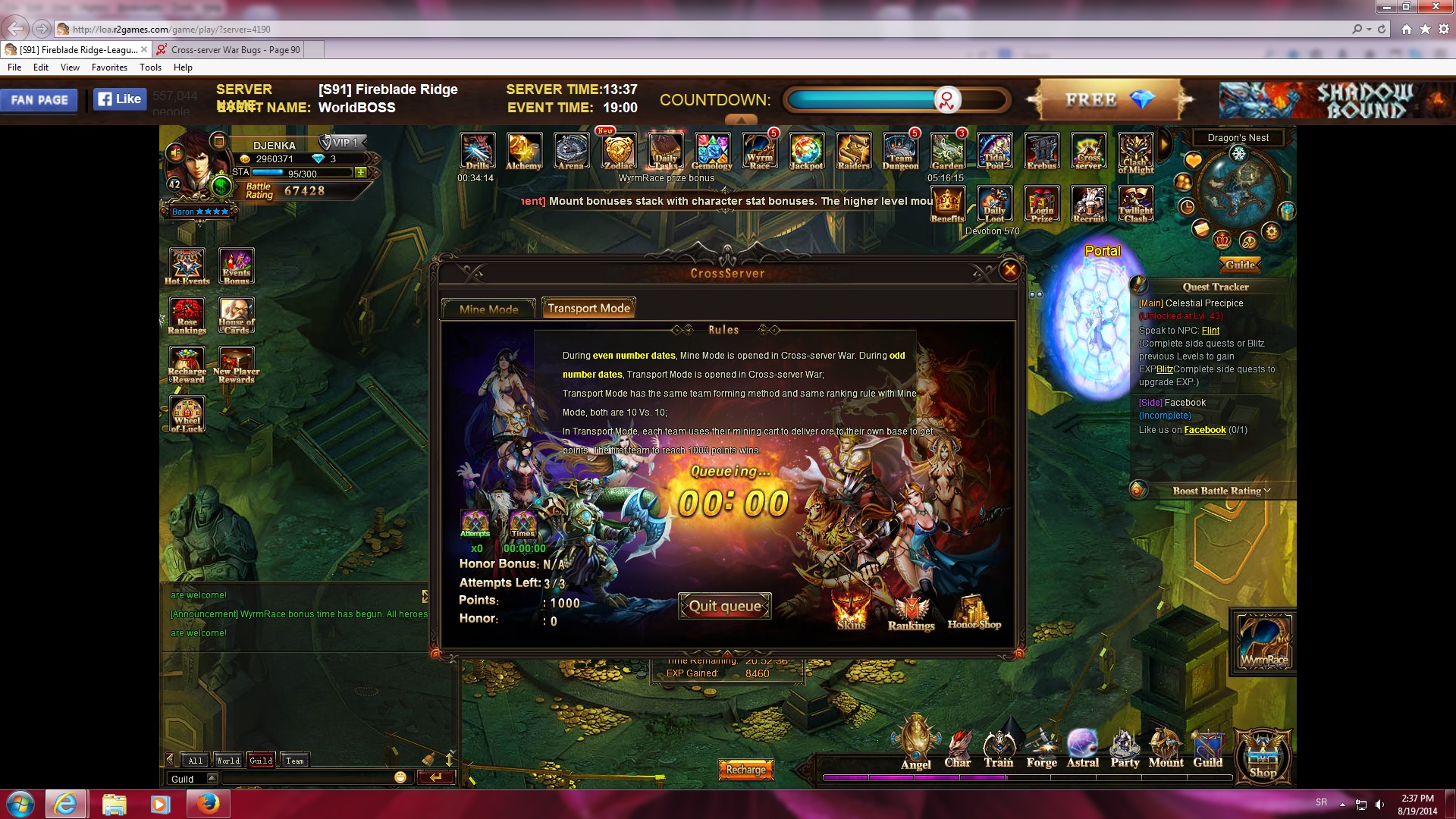 Short Description: the Queueing time 25:00 Go to zero without entering the event and i cant get the blazing wings because i cant do rune stones as i am not level 50 yet